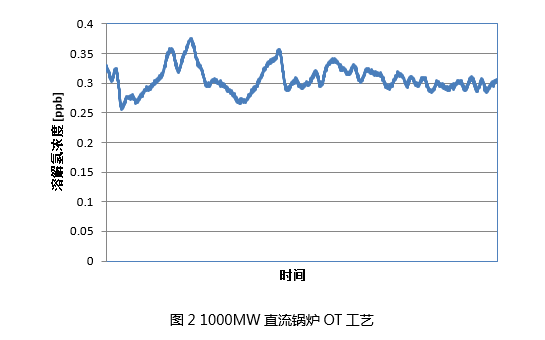 我們分別對600MW AVT和1000MW機(jī)組OT工藝過熱蒸汽出口溶解氫測試,得到的溶解氫數(shù)據(jù)圖1、圖2所示。由圖1可知,機(jī)組在啟動初期,由于熱力設(shè)備表面沒有形成致密的氧化膜,所以溶解氫的含量非常大,一旦機(jī)組運行正常,溶解氧含量逐漸降低,溶解氫也隨之降低并維持在2ppb以內(nèi)。由圖2可知,在1000 MW機(jī)組穩(wěn)定期間,由于OT工藝形成了致密的氧化膜,所以溶解氫的含量趨于穩(wěn)定0.3 ppb左右。而Orbisphere 3655以及510系列溶解氫分析儀具有最低檢出限低(0.03 ppb),以及護(hù)圈和底座技術(shù)來保證零點不發(fā)生漂移,能夠很好的滿足客戶對溶解氫的測量需求。