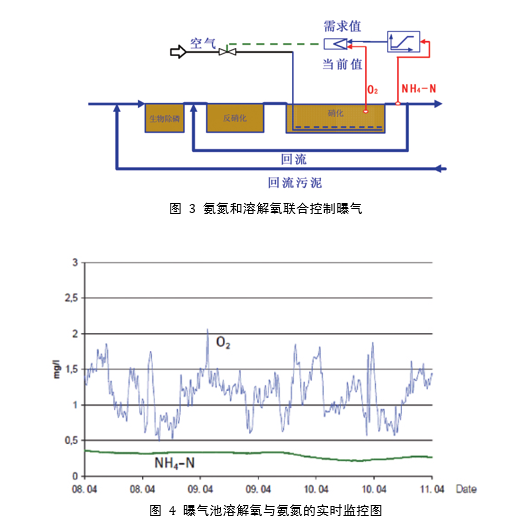 對(duì)于大多數(shù)城市污水處理廠,主要的曝氣能耗是氨氮的硝化因?yàn)榇蟛糠值目山到庥袡C(jī)物已在反硝化過(guò)程中去除。氨氮在溶解氧的作用下轉(zhuǎn)化為硝氮的過(guò)程是整個(gè)脫氮工藝的限速步驟,污水中氨氮對(duì)溶解氧的需求直接反應(yīng)了系統(tǒng)對(duì)溶解氧的需求。如圖 3所示,通過(guò)測(cè)得的氨氮濃度和溶解氧濃度,進(jìn)行疊加控制。調(diào)節(jié)曝氣池總管上的空氣閥開(kāi)啟度,控制供氧強(qiáng)度。濃度一般控制在2mg/L以下,以避免浪費(fèi)能量。同時(shí)也避免由于溶解氧濃度過(guò)高而使大量溶解氧通過(guò)內(nèi)回流帶入到缺氧區(qū)。