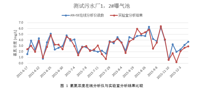下圖是測(cè)試污水廠1,2#曝氣池AN-ISE在線分析儀讀數(shù)與實(shí)驗(yàn)室分析結(jié)果之間的對(duì)比。