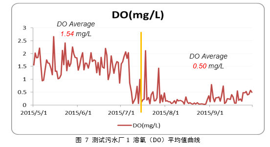 測(cè)試污水廠1精確曝氣系統(tǒng)介入前,手動(dòng)控制曝氣池中的溶氧值。由精確曝氣系統(tǒng)介入后,在排放符合標(biāo)準(zhǔn)的前提下,溶氧的平均值由之前的1.54mg/L,降低至自動(dòng)控制的0.50mg/L。風(fēng)機(jī)的總電耗下降了20%左右,單位COD的風(fēng)機(jī)電耗下降10%,節(jié)能效果顯著。