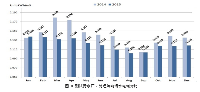 圖 8為測(cè)試污水廠2 2014年與2015年處理每噸廢水所需要的電耗對(duì)比,在引入精確曝氣系統(tǒng)之后,單位電耗有了明顯降低,從2014年的0.140kWh/m3下降至從2015年的0.121kWh/m3,單位能耗下降13.5%,節(jié)能效果顯著。以一個(gè)日處理量為10萬(wàn)噸的污水廠為例,利用AN-ISE在線分析儀的測(cè)量值來(lái)對(duì)風(fēng)量進(jìn)行精確控制,處理每噸污水節(jié)約電耗0.02kWh,電費(fèi)以0.7元/kWh計(jì),每年僅在風(fēng)機(jī)降耗上就能夠節(jié)約電費(fèi)約為51萬(wàn)元。